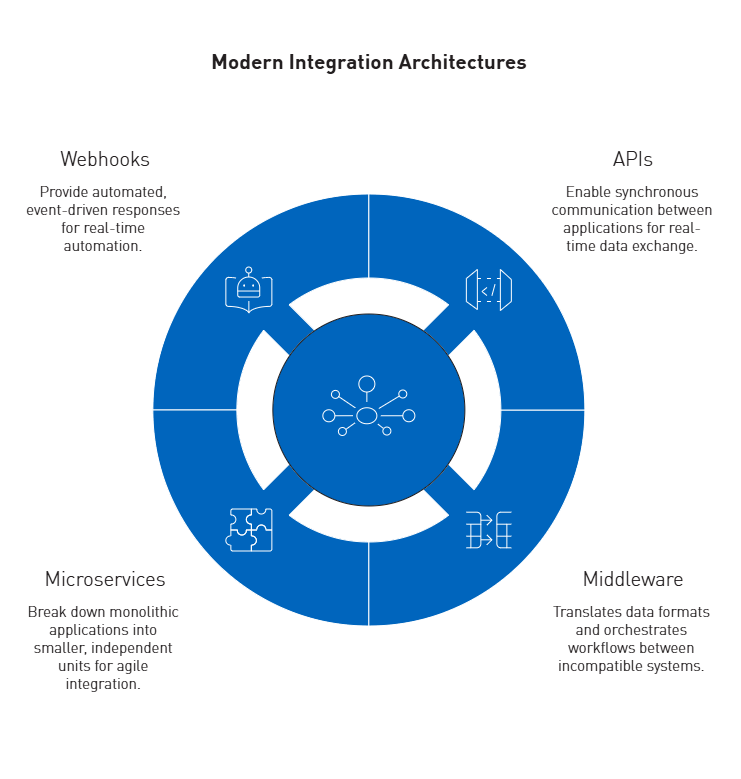 - Application Programming Interfaces (APIs): APIs are the standard building blocks of modern integrations. They allow distinct software applications to communicate synchronously, requesting and delivering data in real time. A well-documented API strategy enables enterprises to connect core platforms seamlessly.