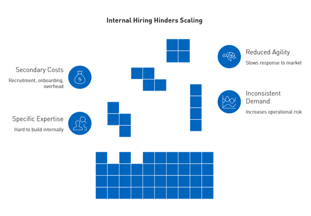 For leadership teams, fixed overhead is not only a financial concern but also a growth constraint. Every permanent expansion decision impacts margins, delivery flexibility, and adaptability. Overbuilding internally can lead to underutilized, costly capacity, while underbuilding may result in missed revenue, delayed delivery, or overextended teams.